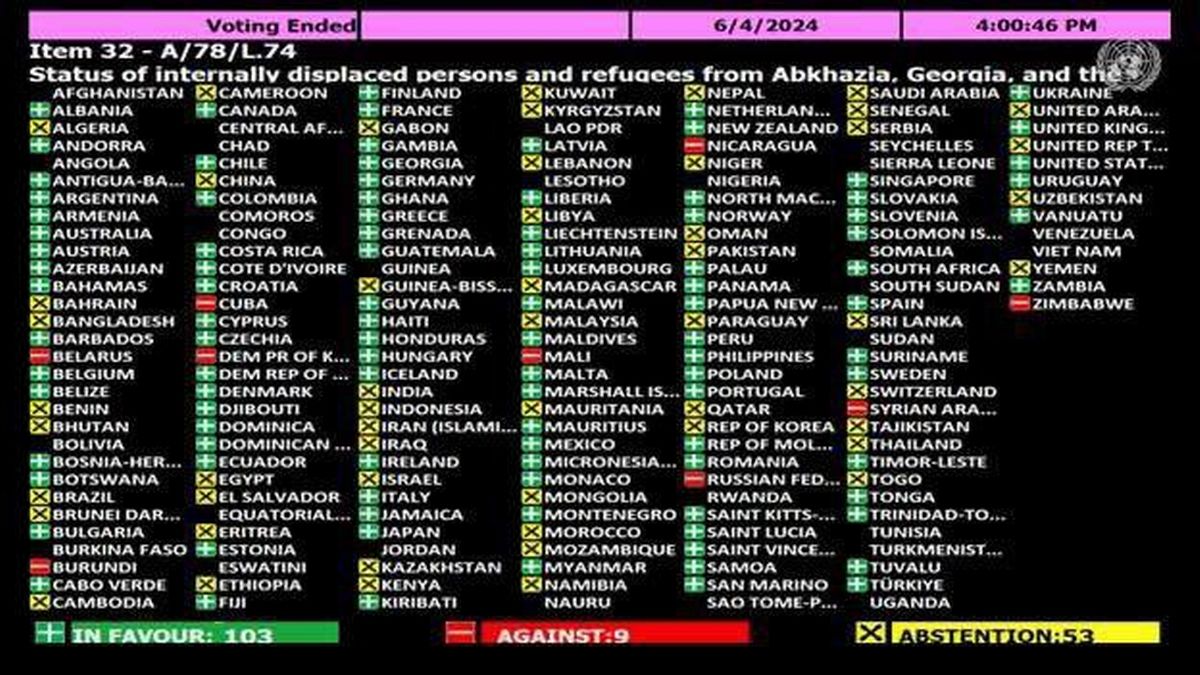 La Asamblea General de la ONU en Nueva York, en el marco de su 78º período de sesiones, adoptó una resolución iniciada por Georgia y 63 países de diferentes regiones del mundo titulada: “Sobre el estatus de los desplazados internos y refugiados de Abjasia, Georgia y el Región de Tskhinvali/Osetia del Sur, Georgia”.