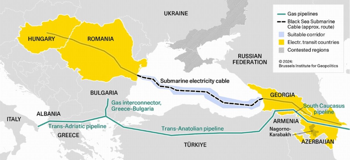 Este megainiciativa impulsada por Bruselas busca reducir la dependencia del gas ruso mediante el uso de energía renovable proveniente de Azerbaiyán y Georgia, con destino final a Rumanía, Hungría y Bulgaria, a través de un cable submarino de 1.195 km que atravesará el mar Negro. Con una capacidad de 1 gigavatio, el proyecto podría completarse hacia 2030, con una financiación europea de 2.300 millones de euros.