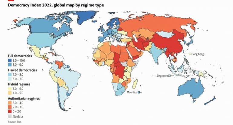El puntaje promedio de democracia en el mundo mejoró ligeramente con respecto al ranking del año pasado, ya que la relajación de las restricciones de Covid aumentó el puntaje en muchos países. Sin embargo, más de un tercio de la población mundial aún vive en países considerados autoritarios, mientras que sólo el 8% vive en plena democracia.