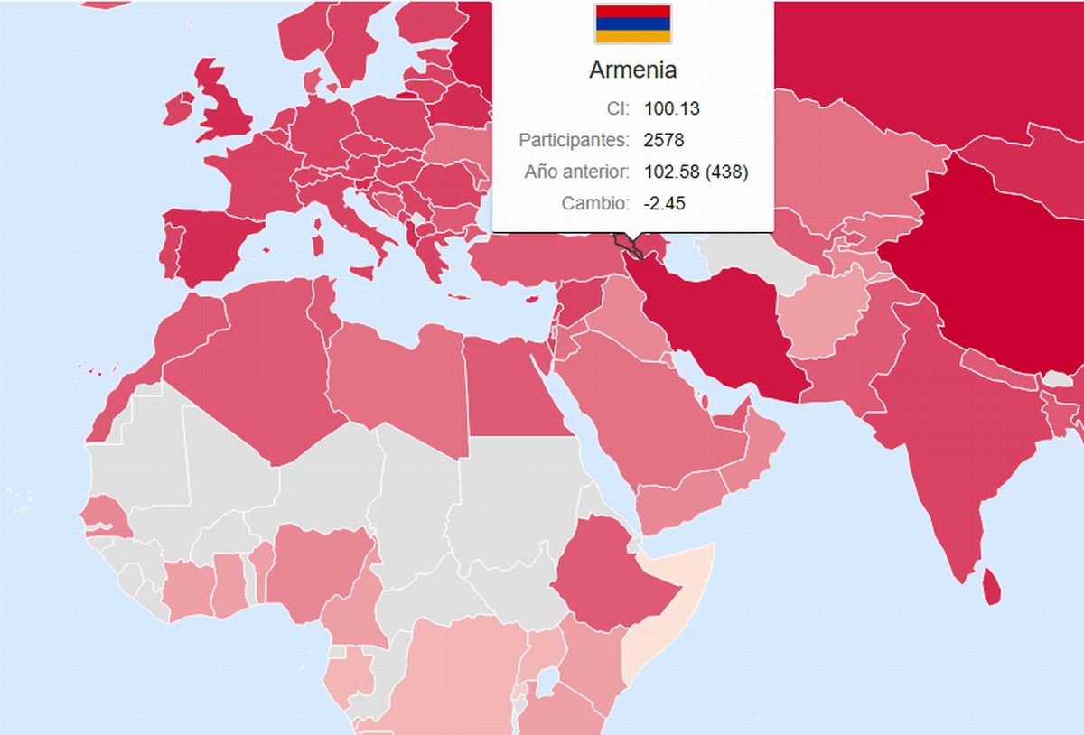 Armenia se posicionó en el puesto 26 del ranking global de coeficiente intelectual, según la clasificación internacional actualizada a comienzos de 2026. El estudio de IIT evaluó el CI promedio de la población en 137 países y territorios.