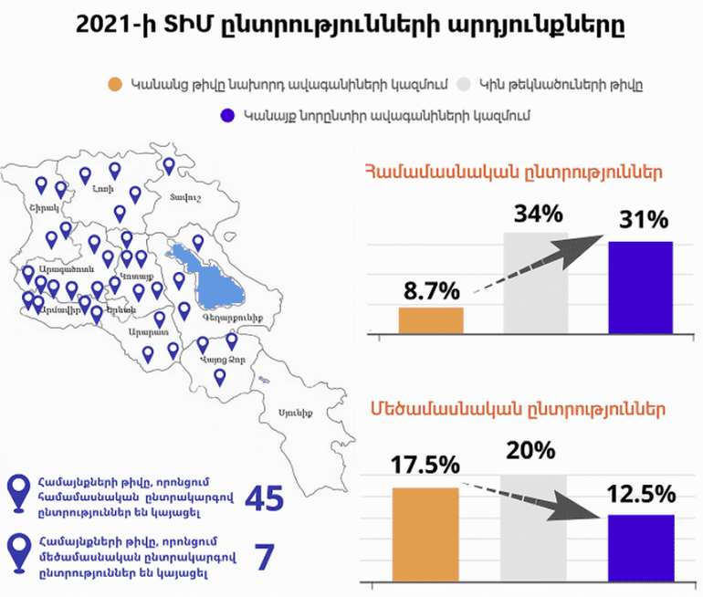 El requisito legal de la cuota de género no se aplica en las elecciones de gobierno local celebradas por el sistema electoral mayoritario, que se celebraron el año pasado en siete comunidades: Arevut, Metsadzor, Arzni, Lermontovo, Shamiram, Ferik, Fioletovo. Este año, las elecciones se llevarán a cabo en la comunidad de Alagyaz por el sistema electoral proporcional. Todas son comunidades que representan minorías nacionales.