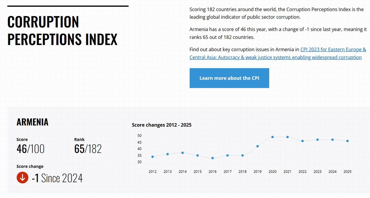 Armenia obtuvo 46 puntos en el Índice de Percepción de la Corrupción 2025 y descendió al puesto 65 entre 182 países. El dato refleja un freno en la calidad institucional y afecta la confianza inversora.