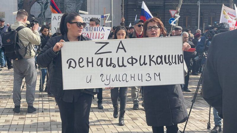 Los manifestantes se reunieron cerca de la embajada rusa de Ereván antes de marchar hacia el centro de la ciudad. Muchos de los manifestantes sostenían recortes de la letra latina ‘Z’, que en las últimas semanas ha sido adoptada por las autoridades rusas como símbolo de apoyo a la ‘operación militar especial’ en Ucrania, y cantaban canciones patrióticas rusas.