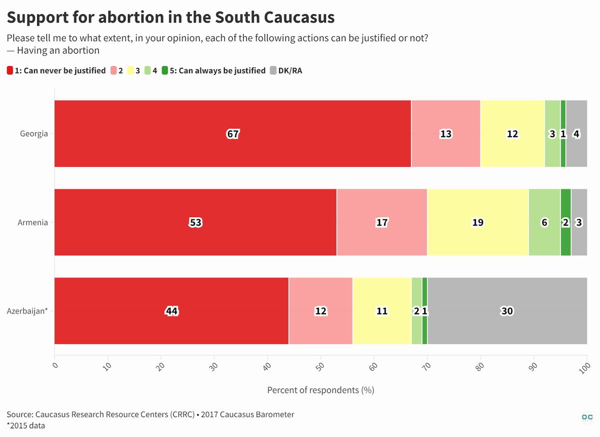 Aunque hay pocos datos sobre las actitudes del público hacia el aborto en Georgia, el 67% de los que respondieron a una encuesta de 2017 realizada por el Centro Caucásico de Recursos de Investigación dijeron que nunca podría justificarse.