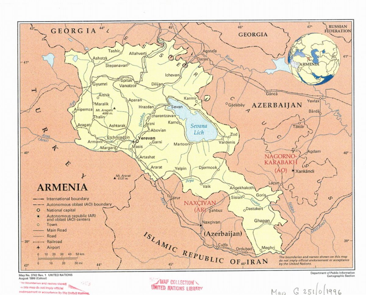 El primer mapa disponible que se puso en circulación en las Naciones Unidas fue proporcionado por Armenia durante la presidencia del primer presidente, Levon Ter-Petrosyan, en 1996 .