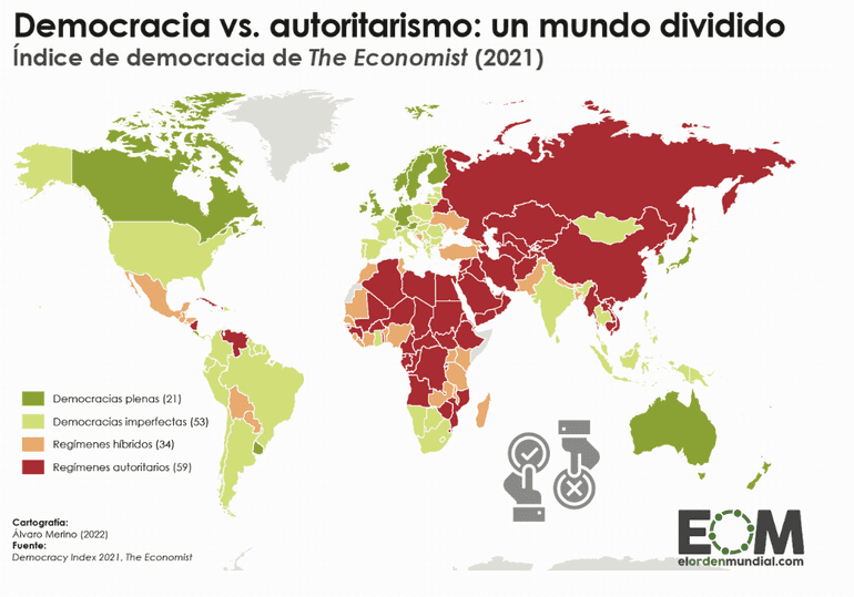 Para agrupar a los países con fines analíticos, el informe de IDEA Internacional titulado ‘Estado mundial de la democracia’ clasifica a los países en tres tipos de regímenes políticos: democracia, régimen híbrido o régimen autoritario.