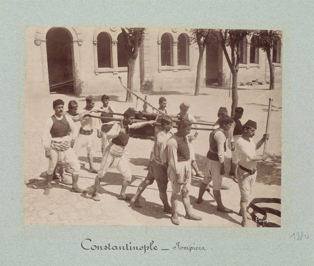 La fotografía de la brigada de bomberos en Constantinopla está coreografiada con menos cuidado, pero sigue llena de energía. Debido a la vejez y la proximidad de los edificios entre sí, así como al uso de vigas de madera en la construcción, la ciudad estaba bajo constante amenaza de incendio. Por lo tanto, los bomberos desempeñaron un papel importante en Constantinopla. Al dedicarles una página en el álbum, los hermanos Abdullah confirmaron su importancia para la sociedad, y también demostraron el alto nivel de preparación de los servicios municipales.