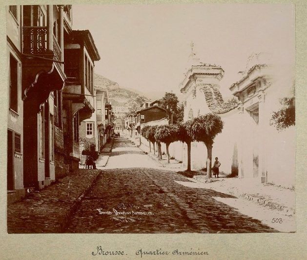 La fotografía del barrio armenio de Brousse tomada por Sebah y Joulier en 1894 es una vista desde una colina. Esta toma también demuestra el dominio de los tonos por parte del fotógrafo. El brillante sol del mediodía creaba dificultades: podía desenfocar algunos detalles de rostros y objetos. Pero Sebach resolvió hábilmente este problema: colocó a un niño pequeño a la derecha de la carretera, a la sombra de un árbol, para reducir el resplandor. Cada persona en la imagen está a la sombra de árboles o edificios.