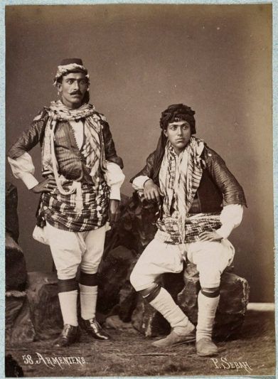 El retrato de dos armenios vestidos de gala muestra que Sebakh dominaba tanto el aspecto técnico como el artístico de la creación fotográfica. Los hombres se paran en poses formales, mostrando sus pantalones anchos, bufandas y sombreros, elementos del traje tradicional armenio. Esta es una fotografía de estudio escenificada que Sebah probablemente tomó para mostrar a los miembros del grupo étnico armenio. El fotógrafo también presta atención a la tonalidad de la imagen: el color sepia en la foto cambia de claro a oscuro, organizando sombras y reflejos.