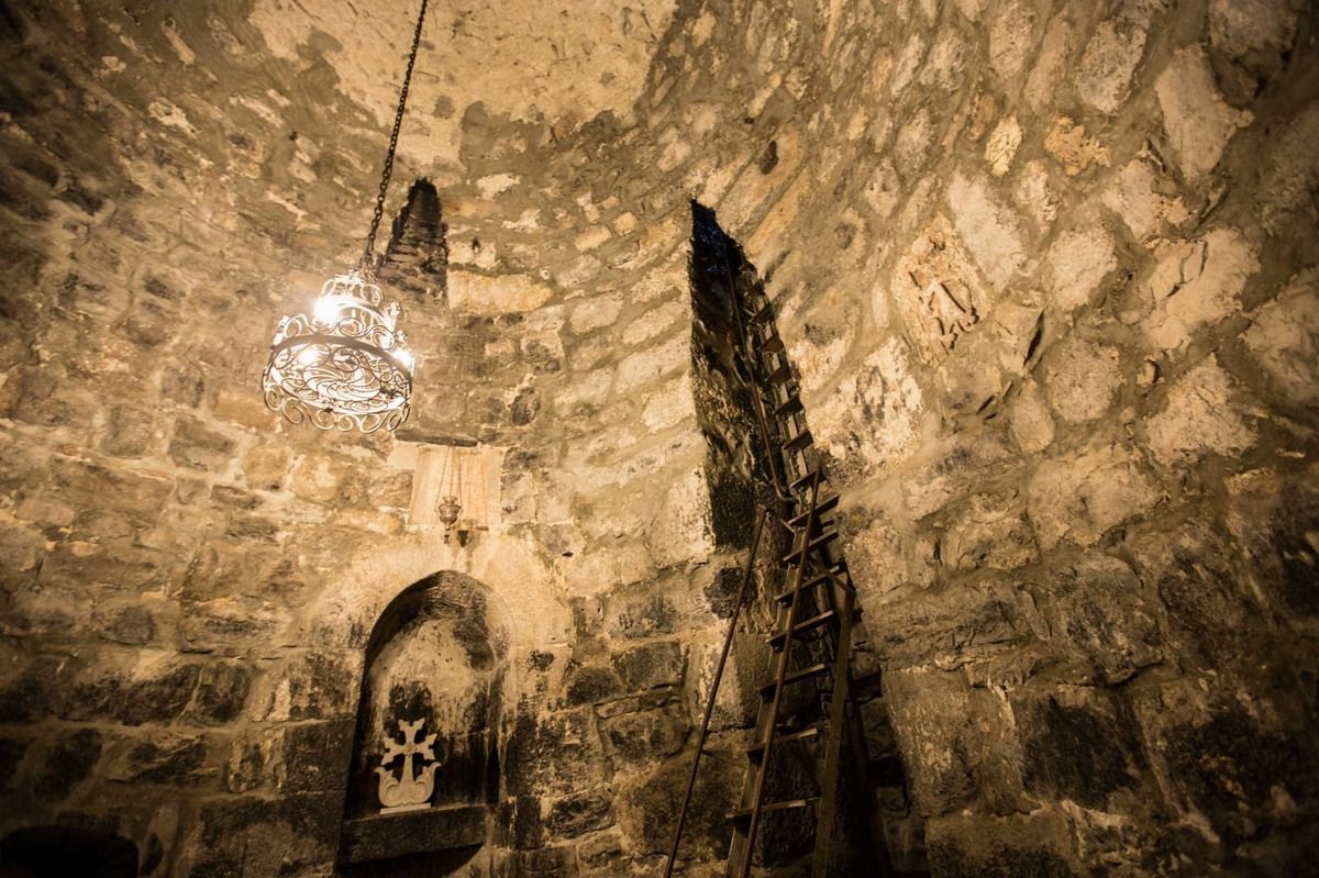 Entre los dos fosos situados bajo la actual capilla, el de Gregorio es el más profundo: 6 metros de profundidad y 4,4 metros de ancho. Es accesible a través de dos discretas aberturas. En el pozo hay una pequeña cámara y una escalera que conduce a una pequeña habitación. Junto al altar en el calabozo hay una sala principal con una escalera de caracol que desciende a la celda de Gregorio el Iluminador. El descenso al pozo alcanza una profundidad de 60 metros.