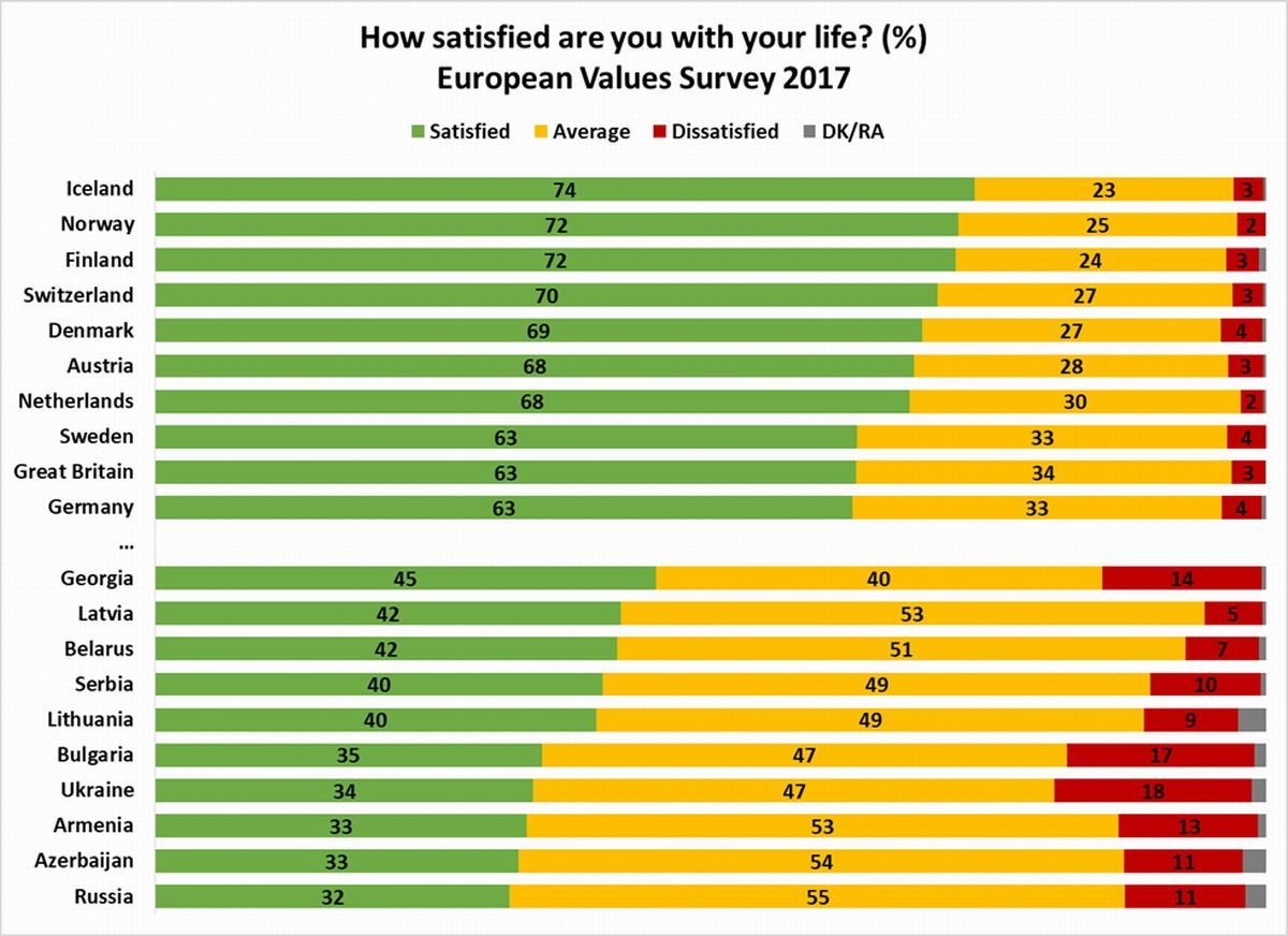 Los datos anteriores muestran que las personas más satisfechas de Europa viven en Islandia, Noruega y Finlandia, y las menos satisfechas viven en Armenia, Azerbaiyán y Rusia. Según sus indicadores, Georgia se encuentra entre estos países.