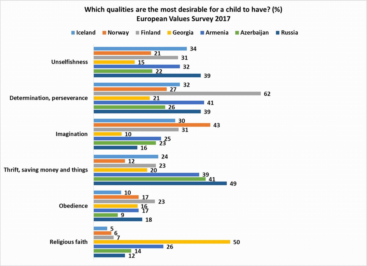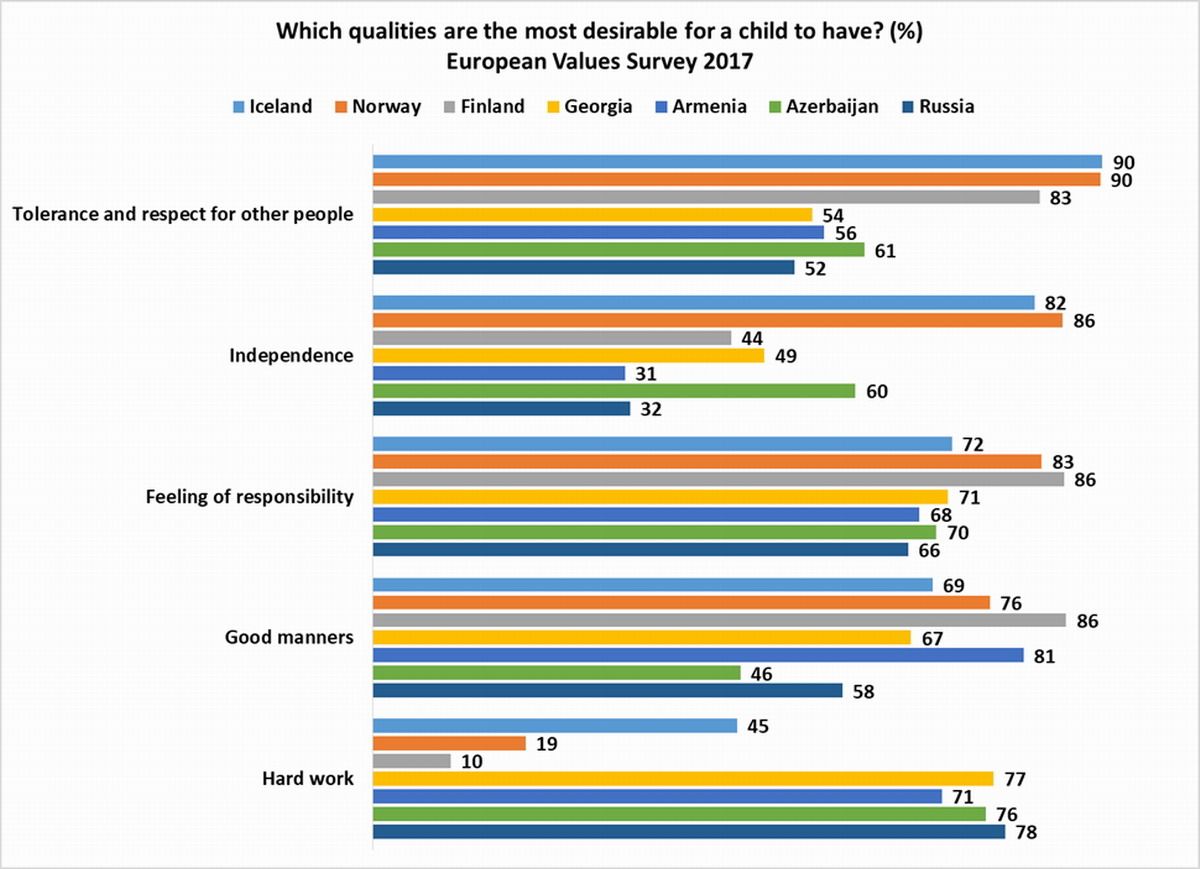 Si bien más del 70% de los encuestados considera que el trabajo arduo es la cualidad más deseable que debe tener un niño en el sur del Cáucaso y Rusia, este porcentaje es significativamente más bajo en Islandia (45%), Noruega (19%) y Finlandia (10%).
